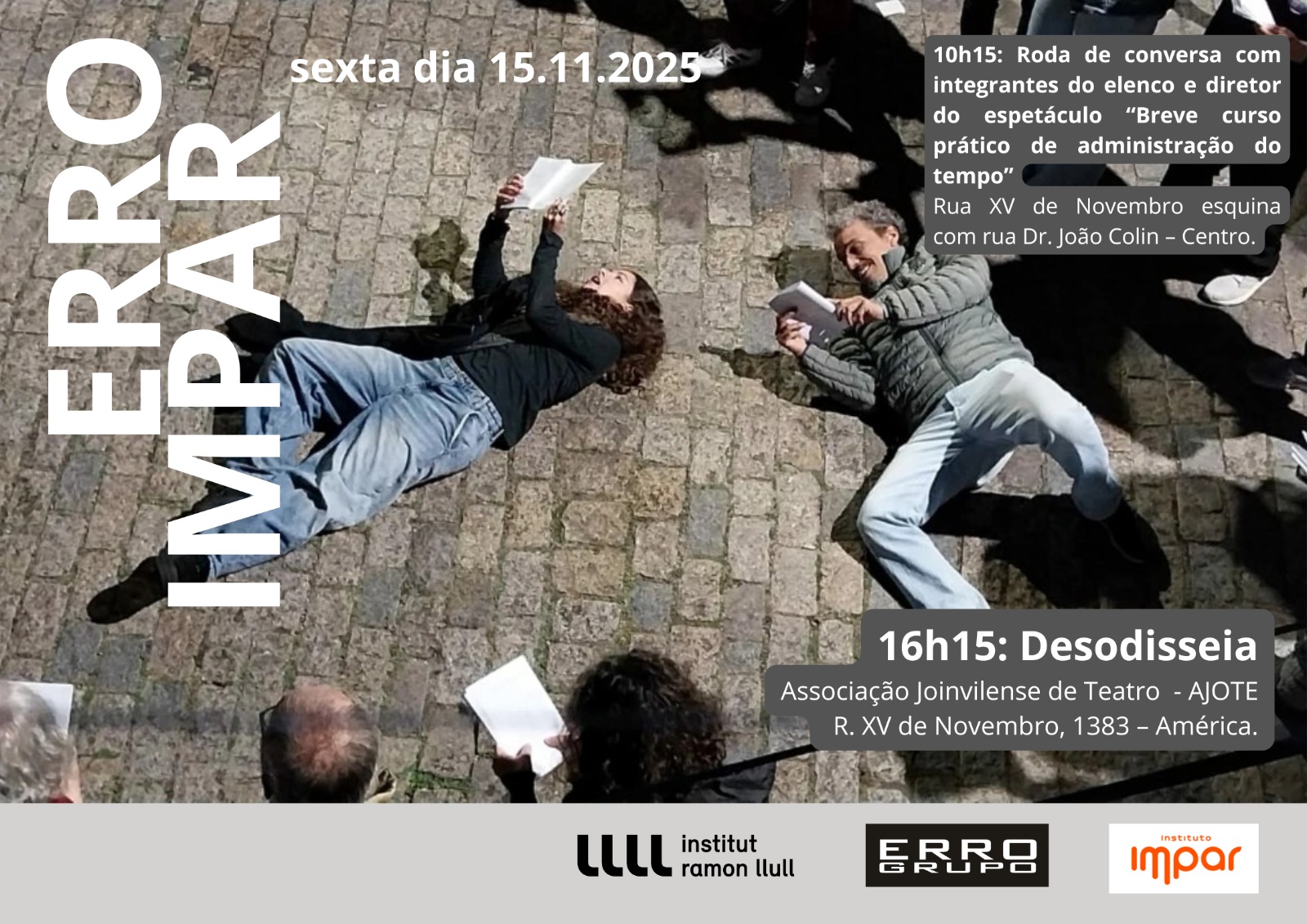 A cada ciutat, l’ERRO també farà activitats paral·leles. A Joinville, realitza en col·laboració amb l’Instituto IMPAR (@instituto_impar) una roda de conversa sobre l’experiència de crear amb i al carrer amb l’elenc de l’espectacle Breve curso prático de administração do tempo (2015), creació conjunta entre artistes del col·lectiu joinvilense i de l’ERRO Grupo.